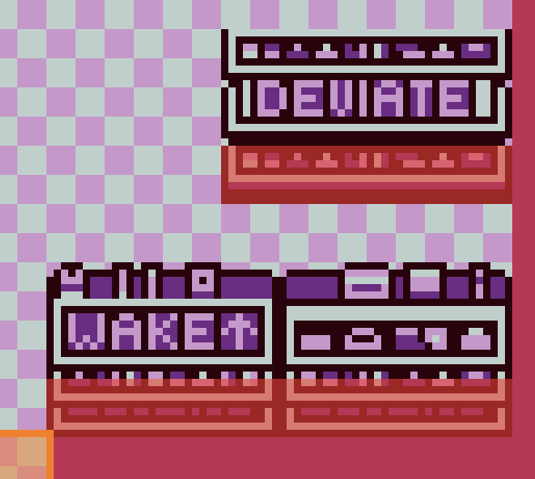 - Implemented animated Wibis signage that flickers erratically, using variable frame timing to give it an off-kilter, possessed energy. I’d like to actually make this longer, but i’m not sure if it will upset the memory capabilities of GB Studio. I’d like it to look “dark” or off for an extended period of time and then flash back on.