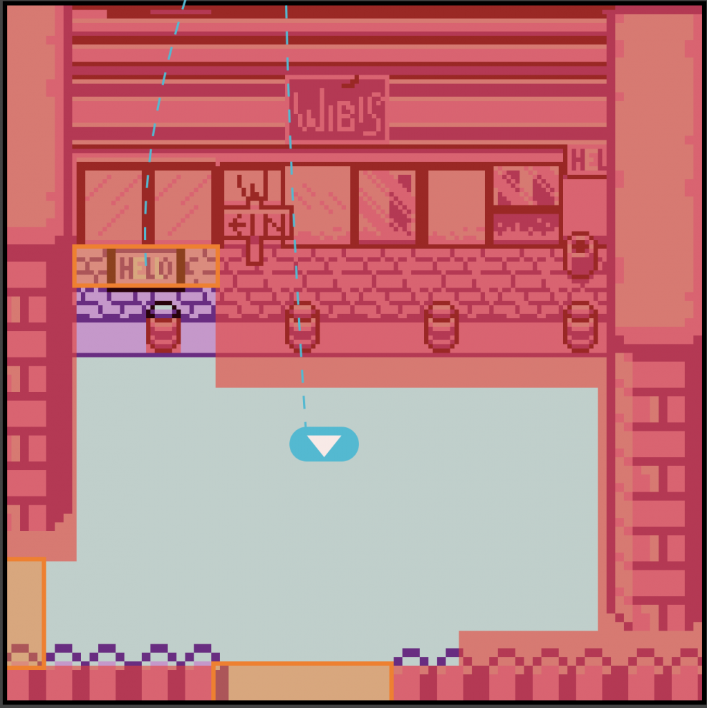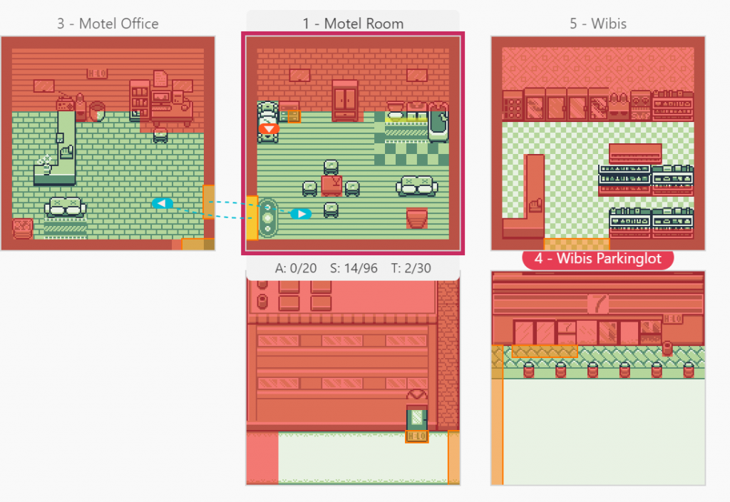 Moving back to the GB Studio environment, you can see where the maps I’ve worked on are being placed. I selected the motel room door, which is the highlighted orange box, to show what room transitions look like when they’re put in. That’s the dotted line that leads to the blue rectangle. The white arrow is the direction the sprite will be facing. The orange rectangle on the bed is the sprite’s spawn location and facing direction. All the red sections are “collision” spots for the sprites. I didn’t fix the collision in the office yet, so you can see where it isn’t correct in this screen shot, but in the other scenes, like the Wibis interior or exterior you can see all the places the sprite will collide with an “object.” You can also see all the orange rectangles that show where the character will transition in the live game!