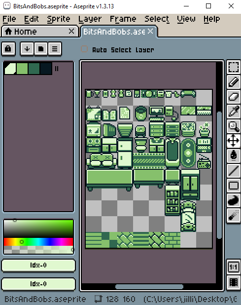 So, the next step is to use programs Aesprite and Tiled – Aesprite to make/modify pixel art, and Tiled to build the maps. This has been an interesting process and is also driving me insane, because we’re working in the gameboy standard Shades of Green. Here’s a screen shot from Aesprite, where I’m removing the bright green transparency green screen layer from the assets I purchased off of itch.io to make this game.