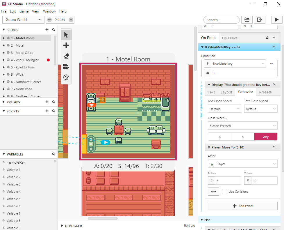 This is a basic if/else statement in GB Studio. This is the trigger to leave the motel room; so, when the sprite “enters” the trigger rectangle, it runs this script. First, it checks for the boolean value of the sprite’s “hasMotelKey” variable. This is default set to 0 or false. If you try to leave without the key it will say, “You should grab the key before you go.” and then the sprite will move back towards the bed side table. “Display..” is the dialog, “Player move to..” is the forced movement. If the character DOES have the key, their variable is hasMotelKey = 1, or true, and they can move out the door into the motel office. When they return there is a similar check for the key to get into the room.