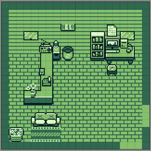 Here’s a revamped version of the hotel office without those weird transparency issues. As you can see, just something as simple as learning to pay attention to layers (like you do in Photoshop, etc) can make a huge impact on the way the maps look in the game! I’ve also learned (the hard way, as usual!) to ensure that sprites can get through the spaces I mean for them to get through. This means I have to be sure they are at least 16 pixels wide, with each square on the map being 8×8 pixels.
